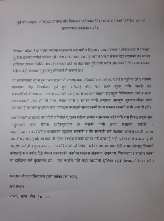 - दुःख-कष्ट र आपत-विपदको घडीमा आफ्नो तर्फबाट हिमानी कोषलाई रू २ करोड दिई नेपाल सरकारको ‘कोरोना भाइरस संक्रमण, रोकथाम, नियन्त्रण र उपचार कोष’ मा सहयोग गरिने पूर्वराजाले विज्ञप्तिमा उल्लेख गरेका छन् ।