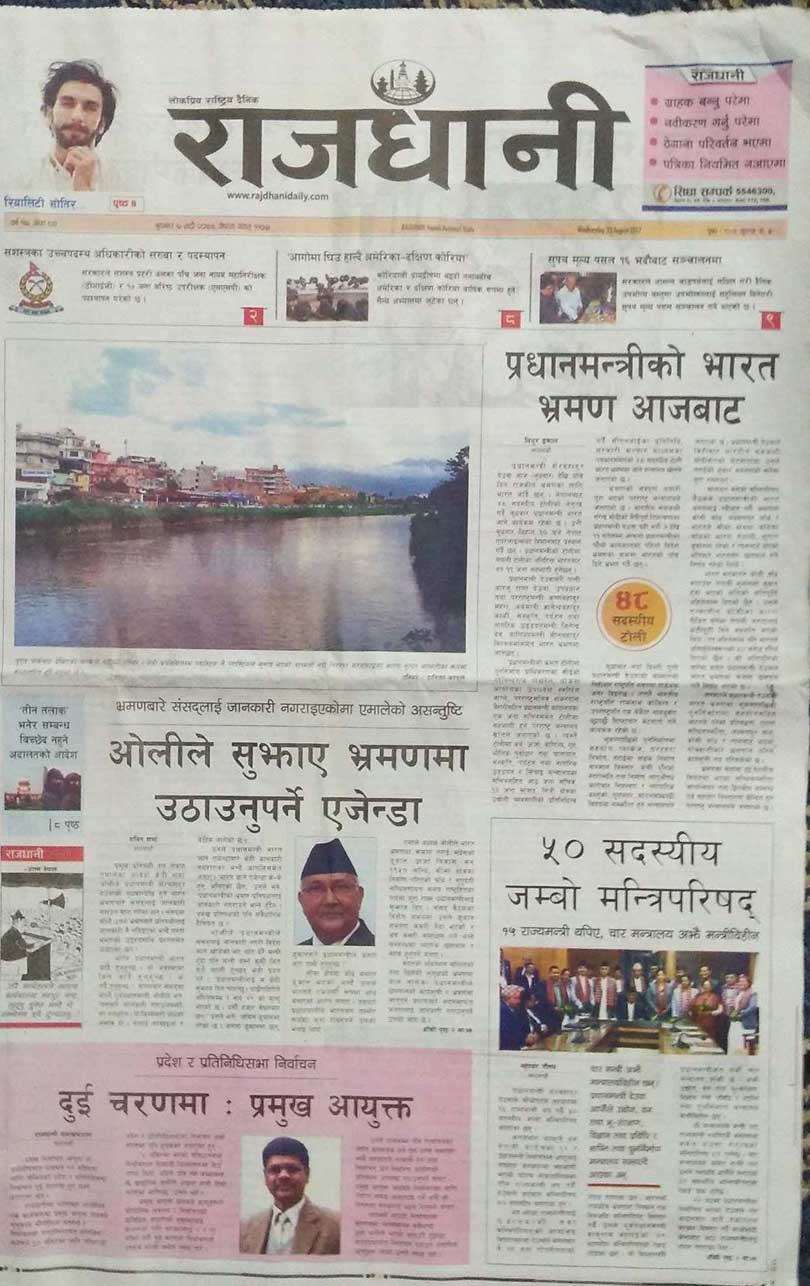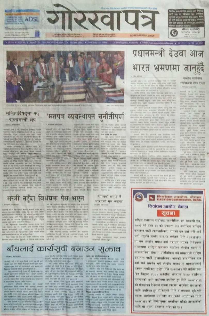 गोरखापत्र दैनिकले प्रधानमन्त्री शेरबहादुर देउवा आज भारत भ्रमणमा जान लागेको विषयलाई मुख्य खबर बनाएर छापेको छ । बाँधलाई कार्यसूची बताउन प्रमुख प्रतिपक्षी दलका नेता केपी शर्मा ओलीले प्रधानमन्त्रीलाई दिएको सुझावलाई गोरखापत्रले एंकर बनाएको छ ।