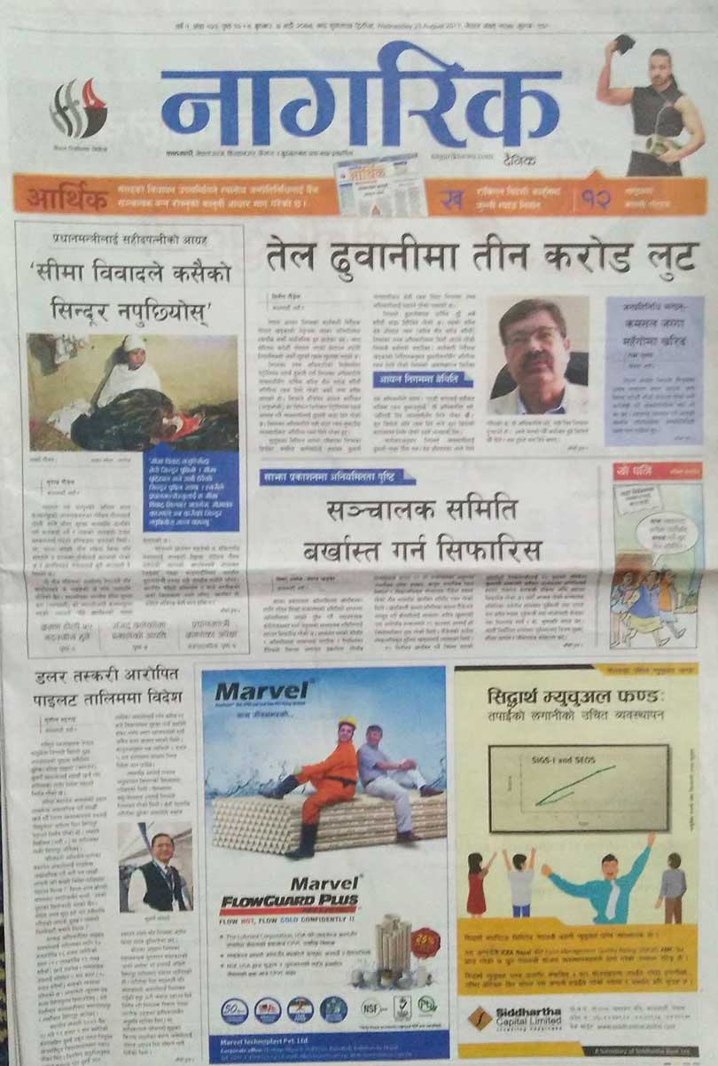आयल निगमका कार्यकारी निर्देशक गोपाल खड्का नेतृत्वको व्यवस्थापनले तेल ढुवानीमा तीन करोड लुट गरेको खबरलाई नागरिक दैनिकले मुख्य खबर बनाएर लेखेको छ । नागरिकमै डलर तस्करीका आरोपितलाई नेपाल वायुसेवा निगमले लाखौं खर्चेर तालिमका लागि विदेश पठाउन लागेको लेखेको छ । सहीदपत्नीले सीमा विवाद सदाका लागि हल गर्न प्रधानमन्त्री शेरबहादुर देउवालाई दिएको सुझावलाई पनि नागरिकले स्थान दिएको छ ।