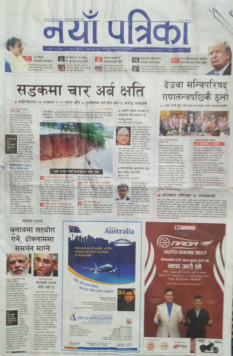 बाढी र पहिरोबाट सडक थिलोथिलो भएको छ । सडकमा झन्डै ४ अर्ब बराबरको क्षति पुगेको आजका पत्रपत्रिकाहरुले लेखेका छन् ।प्रधानमन्त्री शेरबहादुर देउवाको भारतभ्रमणको चर्चा पनि पत्रपत्रिकाले गरेका छन् ।