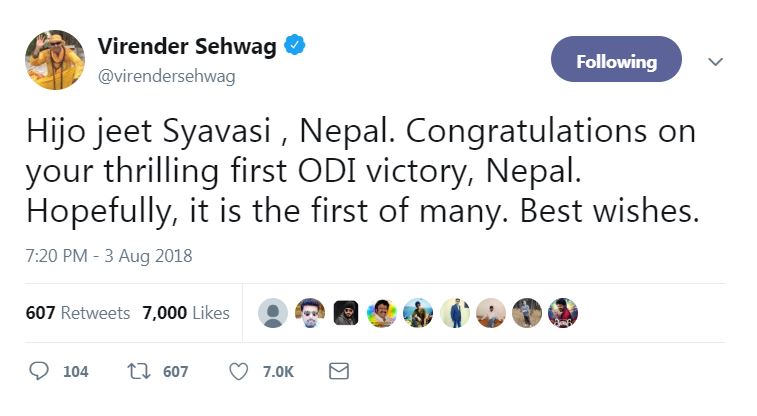 काठमाडाै, २१ साउन । नेपालले शुक्रबार एक दिवसीय क्रिकेट प्रतियोगितामा ऐतिहिक जित निकाल्न सफल भएकोमा अहिले चौतर्फि चर्चा भइरहेको छ । नेपालले यो सफलता हात पार्दा देशविदेशबाट बधाई तथा शुभकामना आइरहेको छ । यसैबीच, चर्चित तथा भारतीय पूर्व क्रिकेटर वीरेन्द्र सहवागले पनि ऐतिहासिक जित निकाल्न सफल भएकोमा नेपाललाई बधाई दिएका छन् ।