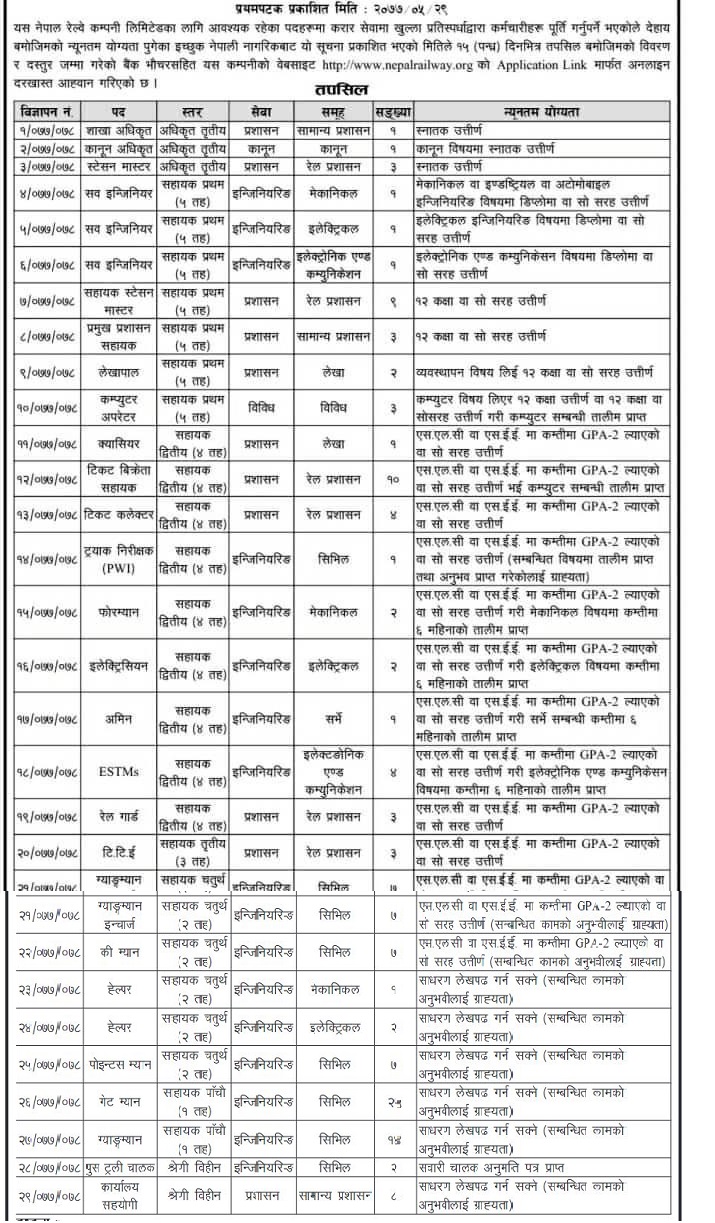 - नेपाल रेल्वे कम्पनीले १ सय २९ कर्मचारी माग गरेको छ ।