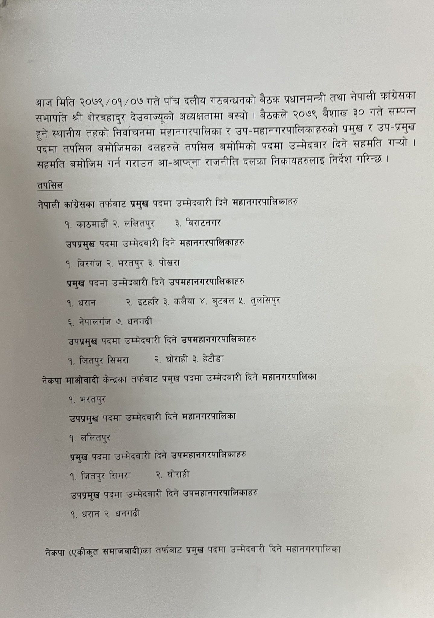 - पाँच दलीय सत्ता गठबन्धनबीच वैशाख ३० गते हुने स्थानीय चुनावमा महानगर र उपमहानगरको भागबन्डा मिलेको छ।