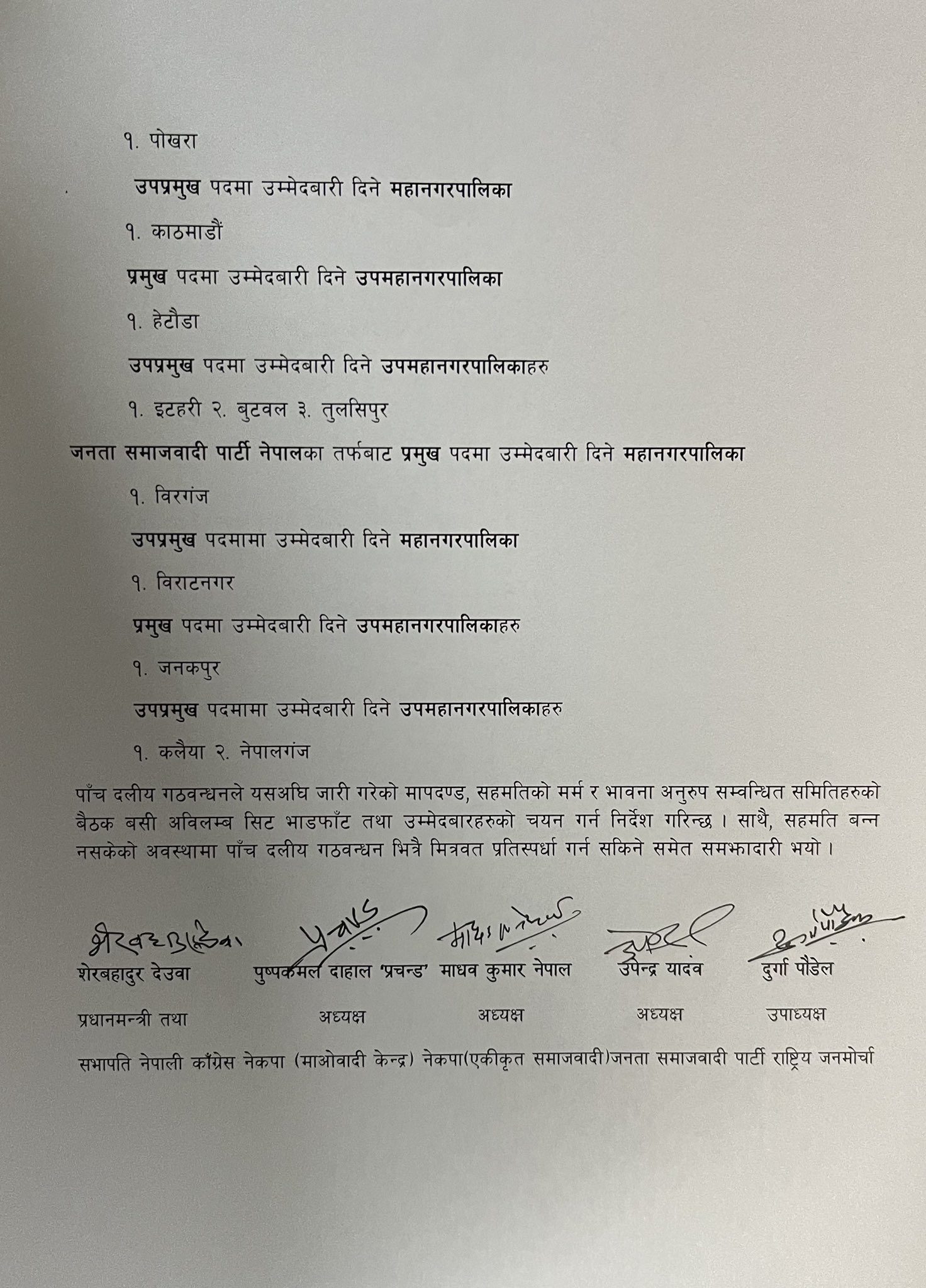 पाँच दलीय सत्ता गठबन्धनबीच वैशाख ३० गते हुने स्थानीय चुनावमा महानगर र उपमहानगरको भागबन्डा मिलेको छ।
