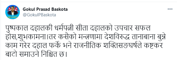 आज सामाजिक सञ्जालमा लेख्दै प्रचण्डले देशविरुद्ध तानाबाना बुन्ने काम गरेर फर्किएमा राजनीतिक शक्तिसंघर्षले कष्टकर बाटो समाउने चेतावनी समेत दिएका छन् । प्रधानमन्त्री केपी शर्मा ओलीका विश्वासपात्र बाँस्कोटाले पटक पटक चेतावनीको शैलीमा प्रचण्ड र माधव नेपालविरुद्ध बोल्दै र लेख्दै आएका छन् ।