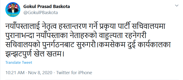 उनले लेखेका छन्,‘नयाँपस्तालाई नेतृत्व हस्तान्तरण गर्ने प्रकृया पार्टी सचिवालयमा पुरानाभन्दा नयाँपस्ताका नेताहरुको वाहुल्यता रहनेगरी सचिवालयको पुनर्गठनबाट सुरुगरौ।कमसेकम दुई कार्यकालका झन्झटपुर्ण खेल खतम।’ हिजोमात्रै प्रधानमन्त्री तथा पार्टी अध्यक्ष केपी शर्मा ओलीले पार्टी अब युवा पुस्तालाई हस्तान्तरण गर्नुपर्नेमा जोड दिएका थिए । एपीवान टेलिभिजनबाट प्रसारण भएको एक कार्यक्रममा उनले यस्तो विचार राखेका थिए ।
