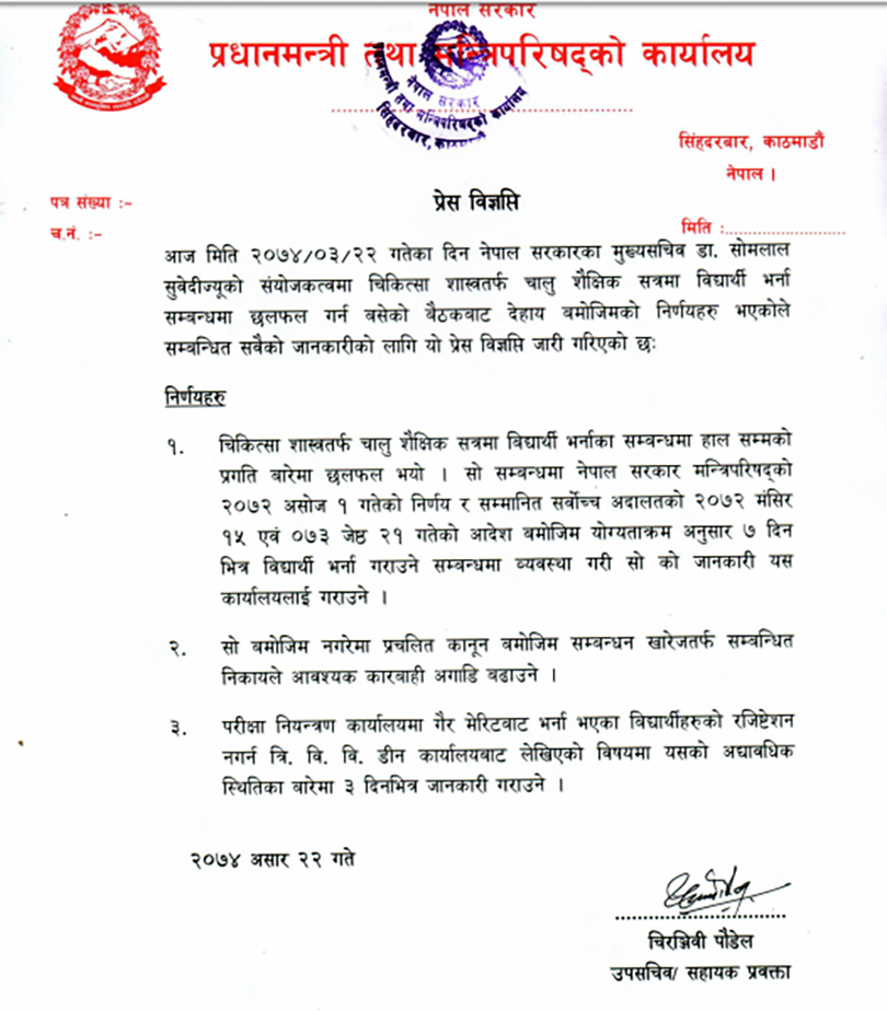 मुख्य सचिव डा. सोमलाल सुवेदीको अध्यक्षतामा बसेको बैठकले मन्त्रिपरिषद बैठकको ०७२ साल असोज १ गतेको निर्णय तथा सर्वोच्च अदालतको ०७२ मंसिर १५ तथा ०७३ साल जेठ २१ गतेको निर्णय अनुसार योग्यताक्रमका आधारमा विद्यार्थी भर्ना गर्न तथा त्यसको जानकारी गराउन निर्देशन दिएको छ ।